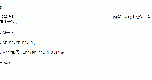 D 【解析】∵DE是△ABC中AC边的垂直平分线, ∴AE=CE, ∴AE+BE=CE+BE=10, ∴△EBC的周长=BC+BE+CE=10+8=18cm, 故选D.