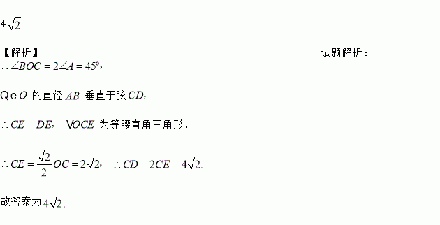 如图,圆O的直径AB垂直于弦CD,垂足是E,∠A=22.5°,OC=4,CD的长为_____.
