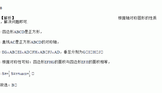 如图,正方形ABCD的边长为1,点E,F分别是对角线AC上的两点,EG⊥AB.EI⊥AD,FH⊥AB,FJ⊥AD,垂足分别为G,I,H,J.则图中阴影部分的面积等于 ( )