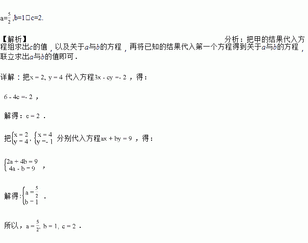 解关于x、y的方程组时,甲正确地解得方程组的解为,乙因为把c抄错了,在计算无误的情况下解得方程组的解为,求a、b、c的值.