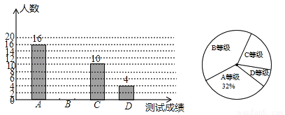 (2016云南省昆明市)某中学为了了解九年级学生体能状况,从九年级学生中随机抽取部分学生进行体能测试,测试结果分为A,B,C,D四个等级,并依据测试成绩绘制了如下两幅尚不完整的统计图;