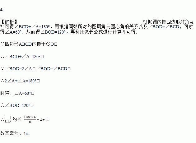 如图,⊙O的半径为6,四边形ABCD内接于⊙O,连接OB,OD,若∠BOD=∠BCD,则弧BD的长为_____.