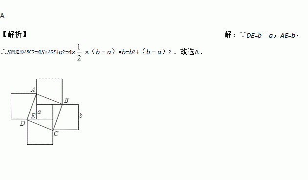 A 【解析】【解析】 ∵DE=b﹣a,AE=b,∴S四边形ABCD=4S△ADE+a2=4××(b﹣a)•b=b2+(b﹣a)2 .故选A.