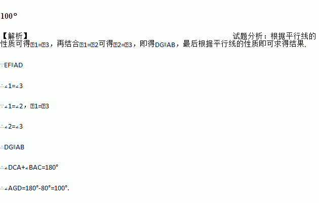 如图,EF∥AD,∠1=∠2,∠BAC=80°.求∠AGD的度数.