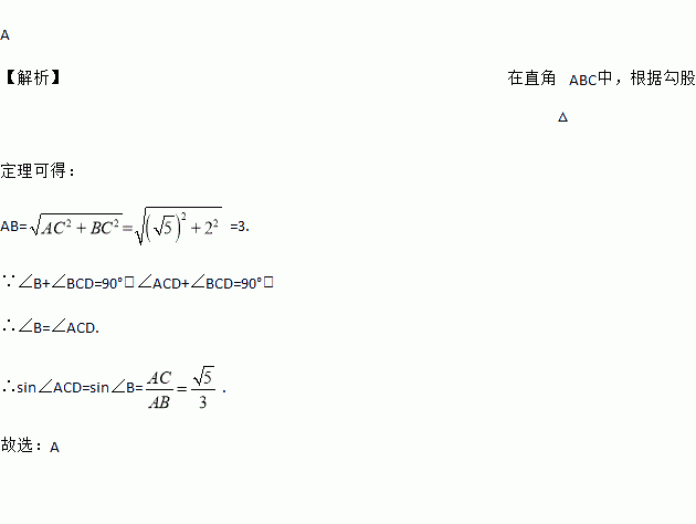 如图,在Rt△ABC中,∠ACB=90°,CD⊥AB于点D.已知AC=,BC=2,那么sin∠ACD等于( )
