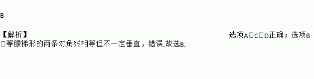 B 【解析】选项A、C、D正确;选项B,等腰梯形的两条对角线相等但不一定垂直,错误.故选B.