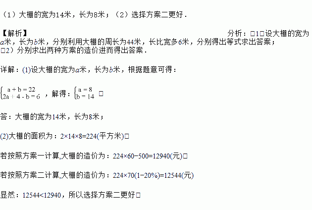 (2)现有两种大棚造价的方案,方案一是每平方米60元,超过100平方米优惠500元,方案二是每平方米70元,超过100平方米优惠总价的20%,试问选择哪种方案更优惠?