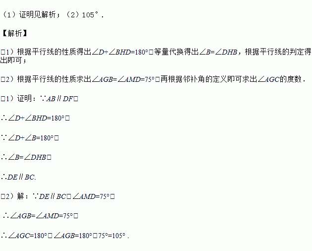 如图,已知直线AB∥DF,∠D+∠B=180°.