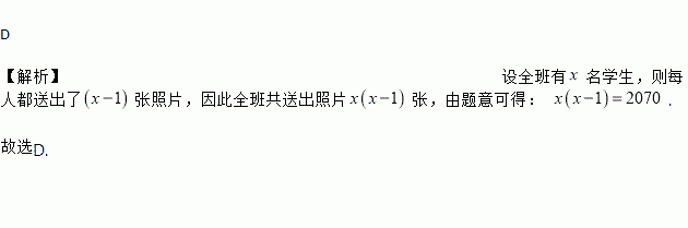 D 【解析】设全班有名学生,则每人都送出了张照片,因此全班共送出照片张,由题意可得: . 故选D.