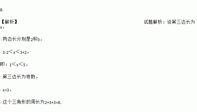 8. 【解析】试题解析:设第三边长为x, ∵两边长分别是2和3, ∴3-2<x<3+2, 即:1<x<5, ∵第三边长为奇数, ∴x=3, ∴这个三角形的周长为2+3+3=8.