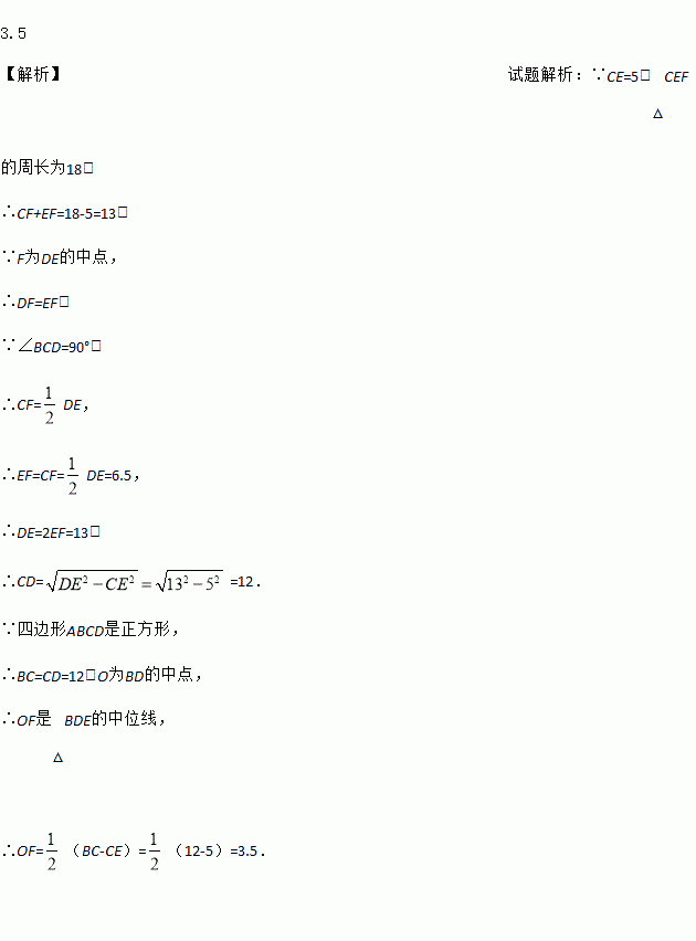 如图,在正方形ABCD中,对角线AC与BD相交于点O,E为BC上一点,CE=5,F为DE的中点.若△CEF的周长为18,则OF的长为_______.