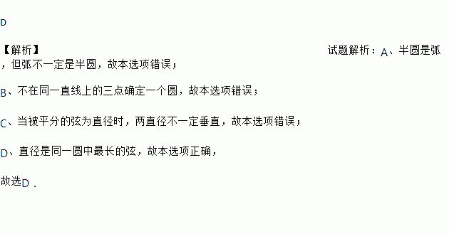 D 【解析】试题解析:A、半圆是弧,但弧不一定是半圆,故本选项错误; B、不在同一直线上的三点确定一个圆,故本选项错误; C、当被平分的弦为直径时,两直径不一定垂直,故本选项错误; D、直径是同一圆中最长的弦,故本选项正确, 故选D.