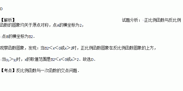 的图象相交于A,B两点,其中点A的横坐标为2,当y1>y2时,x的取值范围是( )