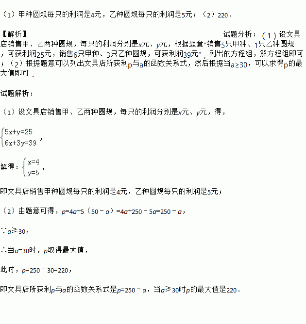 (1)甲种圆规每只的利润是4元,乙种圆规每只的利润是5元;(2)220. 【解析】试题分析:(1)设文具店销售甲、乙两种圆规,每只的利润分别是x元、y元,根据题意“销售5只甲种、1只乙种圆规,可获利润25元,销售6只甲种、3只乙种圆规,可获利润39元”,列出的方程组,解方程组即可;(2)根据题意可以列出文具店所获利p与a的函数关系式,然后根据当a≥30,可以求得p的最大值即可. 试题解...