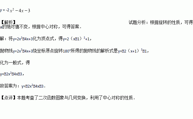 抛物线y=2x2-4x+3绕坐标原点旋转180º所得的抛物线的解析式是___________.
