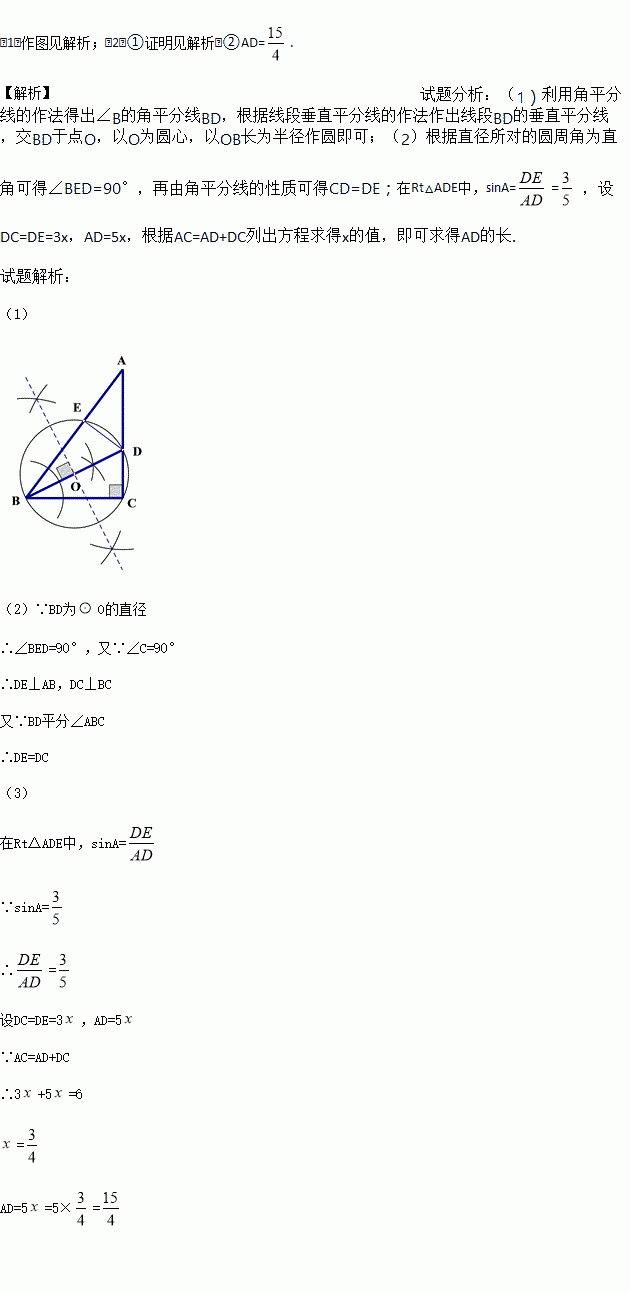(1)利用尺规作∠B 的角平分线交AC于D,以BD为直径作⊙O交AB于E(保留作图痕迹,不写作法);