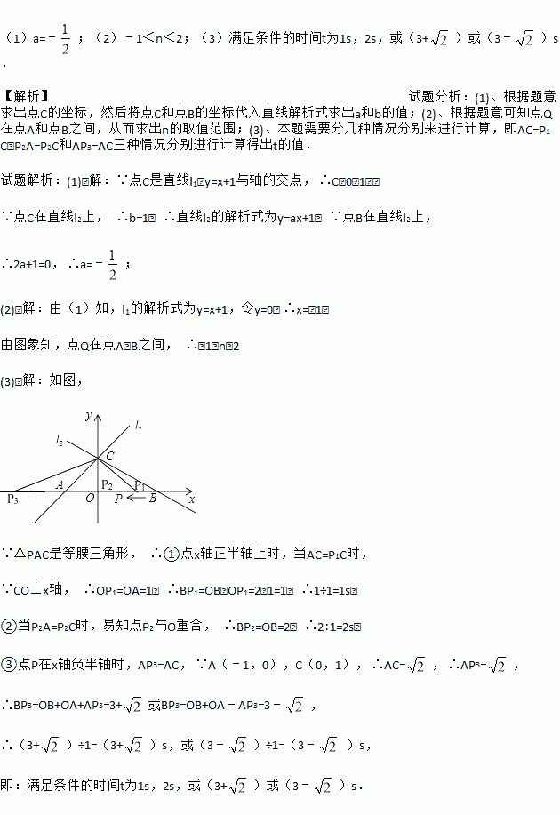 (1)a=﹣;(2)﹣1<n<2;(3)满足条件的时间t为1s,2s,或(3+)或(3﹣)s. 【解析】试题分析:(1)、根据题意求出点C的坐标,然后将点C和点B的坐标代入直线解析式求出a和b的值;(2)、根据题意可知点Q在点A和点B之间,从而求出n的取值范围;(3)、本题需要分几种情况分别来进行计算,即AC=P1C,P2A=P2C和AP3=AC三种情况分别进行计算得出t的值. 试题解...