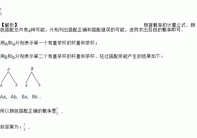 一天晚上,小伟帮助妈妈清洗两个只有颜色不同的有盖茶杯,突然停电了,小伟只好把杯盖和茶杯随机地搭配在一起,则颜色搭配正确的概率是_____.