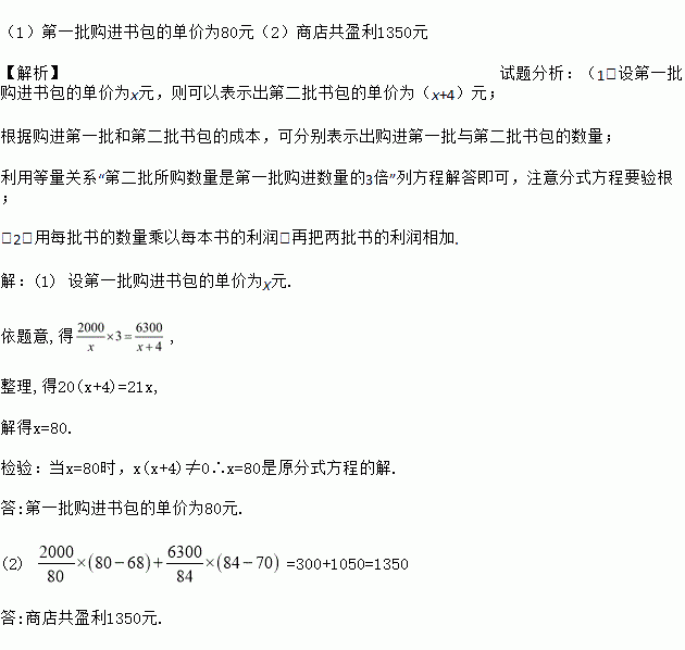 ijÊÐÎÄ»¯¹¬Ñ§Ï°Ê®¾Å´óÓйØÓÅÏÈ·¢Õ¹½ÌÓýµÄ¾«Éñ£¬¾Ù°ìÁËΪijƶÀ§É½ÇøÐ¡Ñ§¾èÔùÊé°ü»î¶¯£®Ê×´ÎÓÃ2000ÔªÔÚÉ̵깺½øÒ»ÅúѧÉúÊé°ü£¬»î¶¯½øÐкó·¢ÏÖÊé°üÊýÁ¿²»¹»£¬ÓÖ¹º½øµÚ¶þÅúͬÑùµÄÊé°ü£¬Ëù¹ºÊýÁ¿ÊǵÚÒ»ÅúÊýÁ¿µÄ3±¶£¬µ«µ¥¼Û¹óÁË4Ôª£¬½á¹ûµÚ¶þÅúÓÃÁË6300Ôª£®