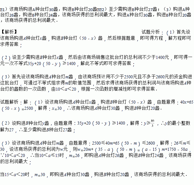 (3)若该商场预计用不少于2500元且不多于2600元的资金购进这批台灯,为了打开B种台灯的销路,商场决定每售出一盏B种台灯,返还顾客现金a元(10<a<20),问该商场该如何进货,才能获得最大的利润?