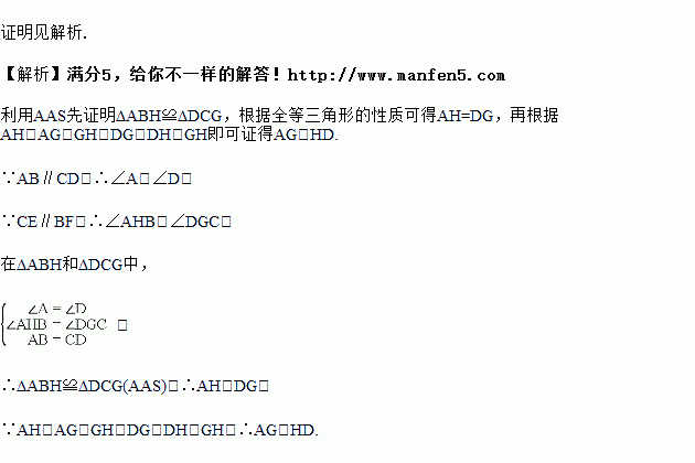 如图,AB∥CD,E、F分别为AB、CD上的点,且EC∥BF,连接AD,分别与EC、BF相交与点G、H,若AB=CD,求证:AG=DH.