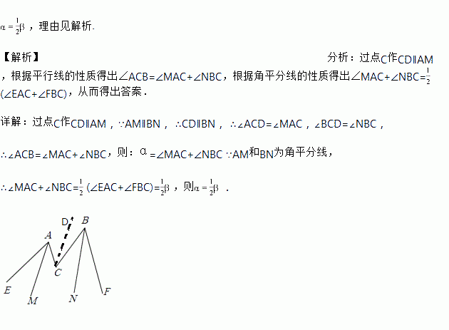 如图,若∠C=α,∠EAC+∠FBC=β,AM是∠EAC的平分线,BN是∠FBC的平分线,若AM∥BN,则α与β有何关系?并说明理由.