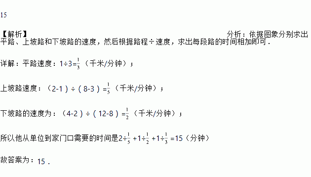 小高从家骑车去单位上班,先走平路到达点A,再走上坡路到达点B,最后走下坡路到达工作单位,所用的时间x(分钟)与离家距离y(千米)的关系如图所示.下班后,如果他沿原路返回,且走平路、上坡路、下坡路的速度分别保持和去上班时一致,那么他从单位到家需要的时间是_______分钟.
