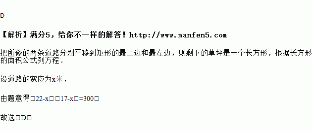 如图,在一块长为22米、宽为17米的长方形地面上,要修建同样宽的两条互相垂直的道路(两条道路各与长方形的一条边平行),剩余部分种上草坪,使草坪面积为300平方米.若设道路宽为x米,则根据题意可列出方程为( )