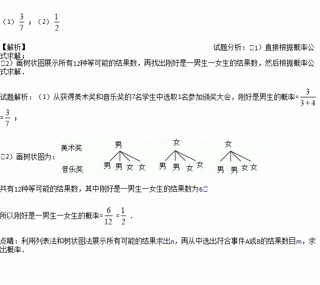 (1)从获得美术奖和音乐奖的7名学生中选取1名参加颁奖大会,求刚好是男生的概率;