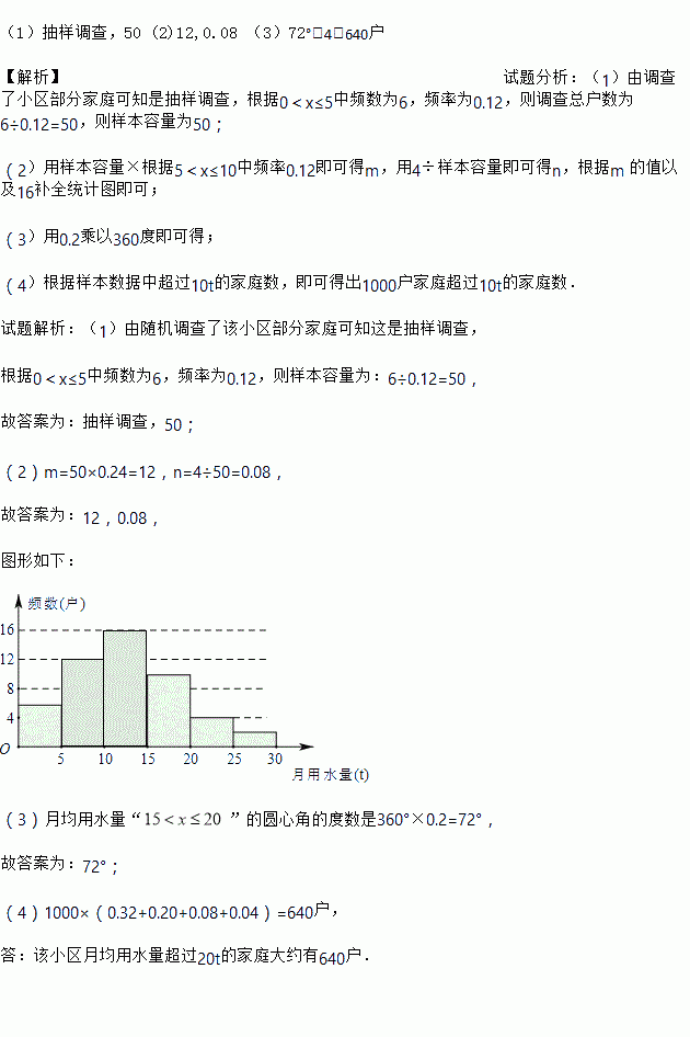 (1)抽样调查,50 (2)12,0.08 (3)72°(4)640户 【解析】试题分析:(1)由调查了小区部分家庭可知是抽样调查,根据0<x≤5中频数为6,频率为0.12,则调查总户数为6÷0.12=50,则样本容量为50; (2)用样本容量×根据5<x≤10中频率0.12即可得m,用4÷样本容量即可得n,根据m 的值以及16补全统计图即可; (3)用0.2乘以360度即可得;...