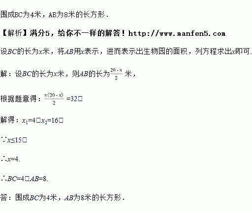 如图,某中学准备用长为20m的篱笆围成一个长方形生物园ABCD饲养小兔,生物园的一面靠墙(围墙MN最长可利用15m)试设计一种围法,使生物园的面积为32m2.