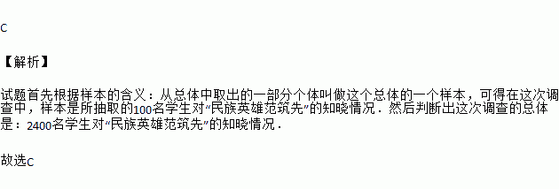 电视剧《铁血将军》在我市拍摄,该剧展示了抗日英雄范筑先的光辉形象.某校为了解学生对“民族英雄范筑先”的知晓情况,从全校2400名学生中随机抽取了100名学生进行调查.在这次调查中,样本是 ( )
