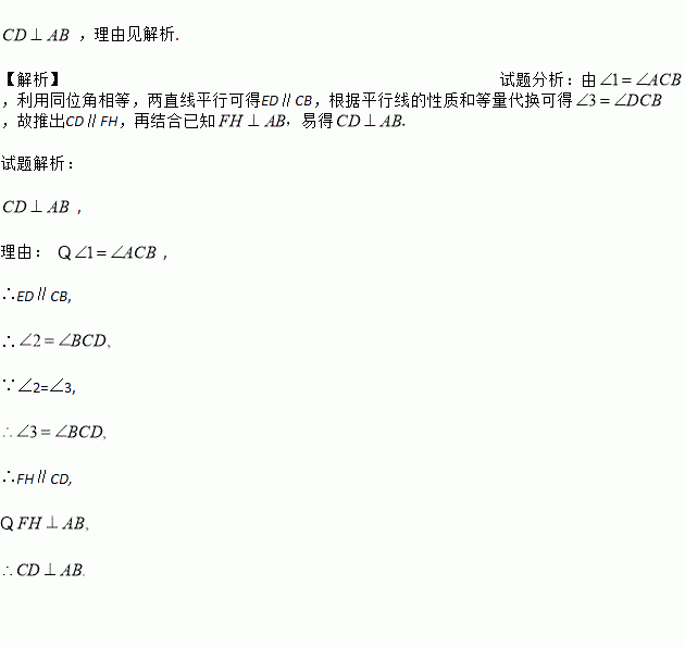 已知,如图, , , 于H,问CD与AB有什么关系?