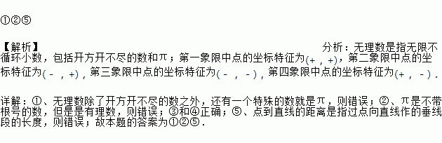有下列说法:①无理数就是开方开不尽的数;②不带根号的数一定是有理数;③若点P(x,y)的坐标满足xy>0,且x+y<0,则点P在第三象限 ;④互为邻补角的两角的平分线互相垂直;⑤点到直线的距离指的是过点向直线作的垂线段。其中不正确的说法有_________________ .(填序号)