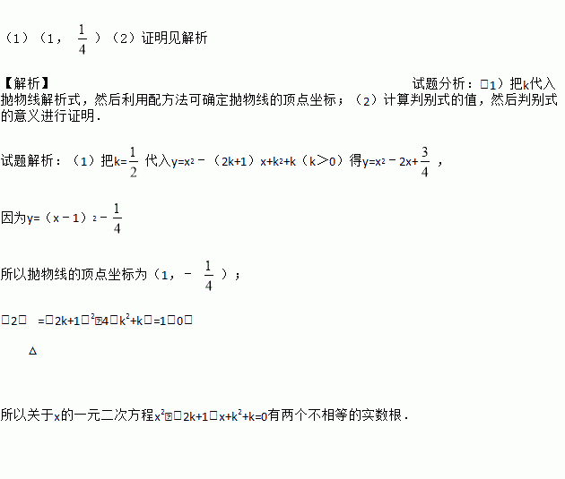 (1)(1, )(2)证明见解析 【解析】试题分析:(1)把k代入抛物线解析式,然后利用配方法可确定抛物线的顶点坐标;(2)计算判别式的值,然后判别式的意义进行证明. 试题解析:(1)把k=代入y=x2﹣(2k+1)x+k2+k(k>0)得y=x2﹣2x+, 因为y=(x﹣1)2﹣ 所以抛物线的顶点坐标为(1,﹣ ); (2)△=(2k+1)2﹣4(k2+k)=1>0...
