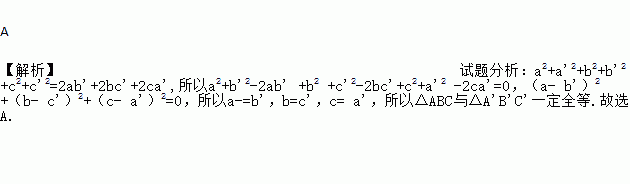 A 【解析】试题分析:a2+a'2+b2+b'2+c2+c'2=2ab'+2bc'+2ca',所以a2+b'2-2ab' +b2 +c'2-2bc'+c2+a'2 -2ca'=0,(a- b')2+(b- c')2+(c- a')2=0,所以a-=b',b=c',c= a',所以△ABC与△A'B'C'一定全等.故选A.