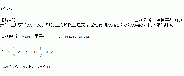 如图,在□ABCD中,对角线AC、BD相交于点O.如果AC=14,BD=8,AB=x,那么x的取值范围是______________.