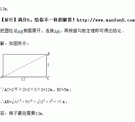 有一圆柱形油罐,如图所示,要从A点环绕油罐建梯子到B点,正好B点在A点的正上方,已知油罐的底面圆的半径为2cm,高AB为5m,问:所建梯子最短需多少米?(π取3)