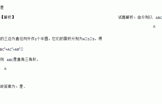 如图,分别以△ABC的三边为直径向外作3个半圆,它们的面积分别为4、5、9,则△ABC____直角三角形.(填“是”或“不是”)