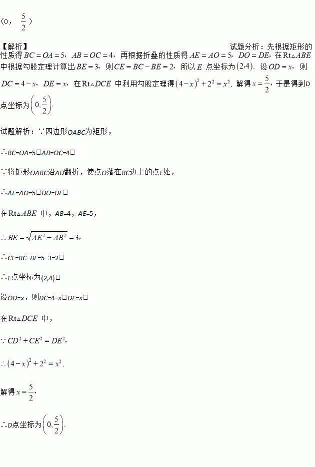 如图,OABC是一张放在平面直角坐标系中的矩形纸片,O为原点,点A在x轴的正半轴上,点C在y轴的正半轴上,OA=5,OC=4.在OC边上取一点D,将纸片沿AD翻折,使点O落在BC边上的点E处.求D,E两点的坐标.