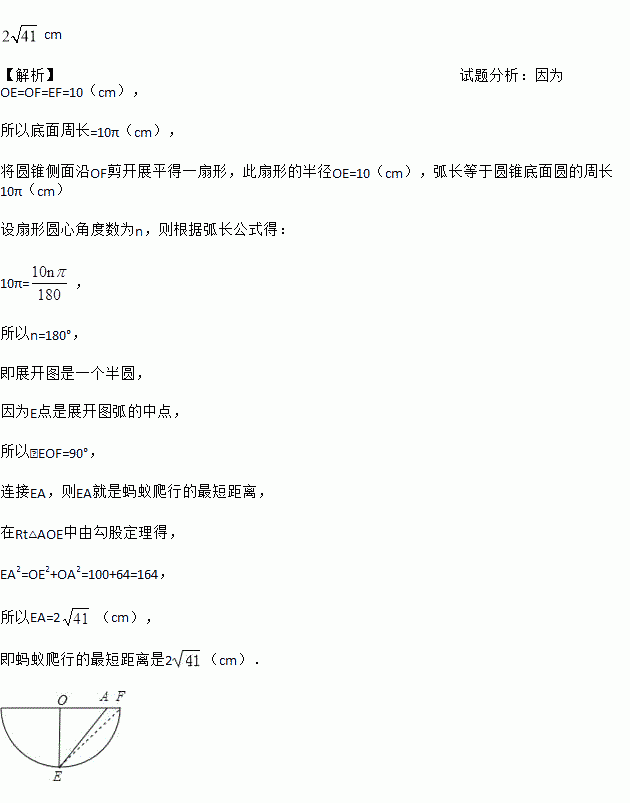 如图是一个用来盛爆米花的圆锥形纸杯,纸杯开口圆的直径EF长为10 cm,母线OE(OF)长为10 cm.在母线OF上的点A处有一块爆米花残渣,且FA = 2 cm,一只蚂蚁从杯口的点E处沿圆锥表面爬行到A点,则此蚂蚁爬行的最短距离为_________.