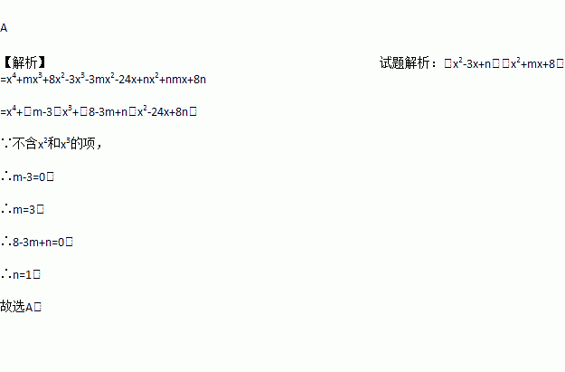 A 【解析】试题解析:(x2-3x+n)(x2+mx+8) =x4+mx3+8x2-3x3-3mx2-24x+nx2+nmx+8n =x4+(m-3)x3+(8-3m+n)x2-24x+8n, ∵不含x2和x3的项, ∴m-3=0, ∴m=3. ∴8-3m+n=0, ∴n=1. 故选A.若关于x的分式方程