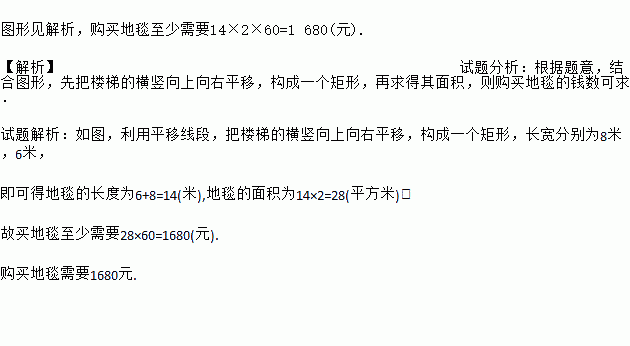 如图,凯瑞酒店准备进行装修,把楼梯铺上地毯,已知楼梯的宽度是2米,楼梯的总长度为8米,总高度为6米,已知这种地毯每平方米的售价是60元.请你帮助酒店老板算下,购买地毯至少需要多少元?