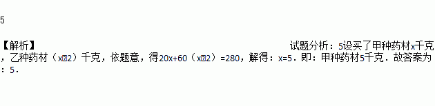 王大爷用280元买了甲、乙两种药材,甲种药材每千克20元,乙种药材每千克60元,且甲种药材比乙种药材多买了2千克,则甲种药材买了___千克.