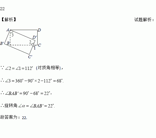 如图,将矩形ABCD绕点A顺时针旋转到矩形AB/C/D/的位置,旋转角为a (0°<a<90°).若∠1=112°,则∠a=______度.