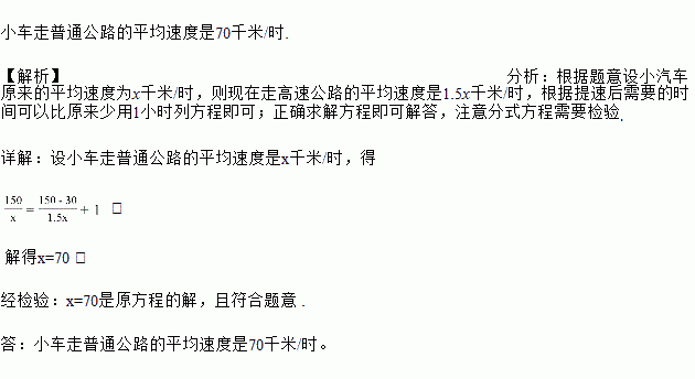 经过建设者三年多艰苦努力地施工,贯通我市A、B两地又一条高速公路全线通车.已知原来A地到B地普通公路长150km,高速公路路程缩短了30km,如果一辆小车从A地到B地走高速公路的平均速度可以提高到原来的1.5倍,需要的时间可以比原来少用1小时.求小车走普通公路的平均速度是多少?