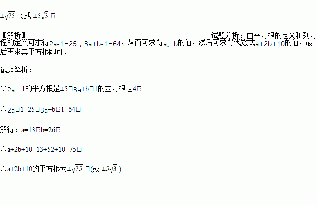 已知2a一1的平方根是±5,3a+b﹣1的立方根是4,求a+2b+10的平方根.