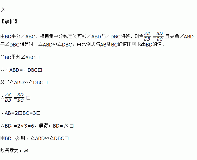 如图,BD平分∠ABC,AB=2,BC=3,当BD=_______时,△ABD∽△DBC.