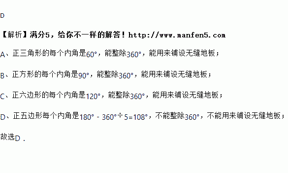小斌家买了一套新房正在进行装修,星期天小斌陪父母一起到瓷砖商店去购买一种多边形形状的瓷砖,用来铺设客厅地面(需无缝),则购买的瓷砖形状不可以是( )