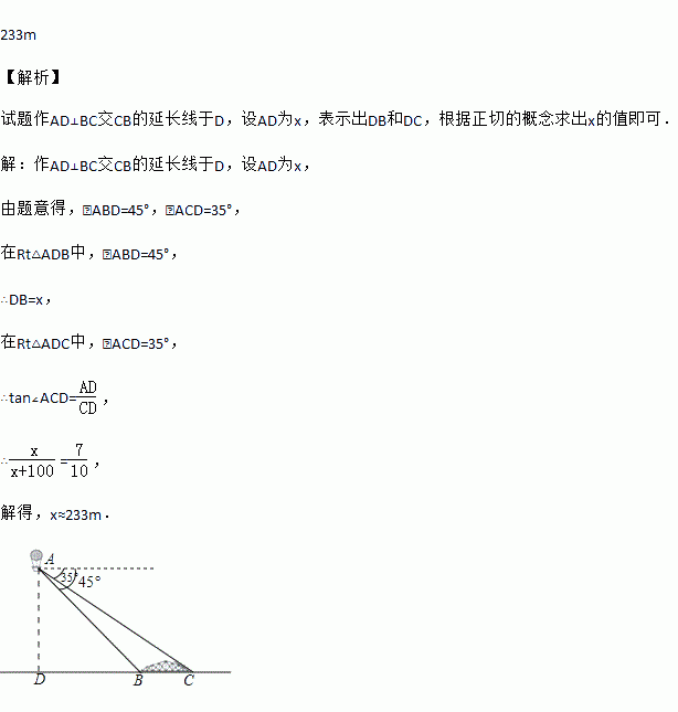 小明在热气球A上看到正前方横跨河流两岸的大桥BC,并测得B,C两点的俯角分别为45°,35°.已知大桥BC与地面在同一水平面上,其长度为100m,请求出热气球离地面的高度.(结果保留整数)(参考数据:sin35°≈